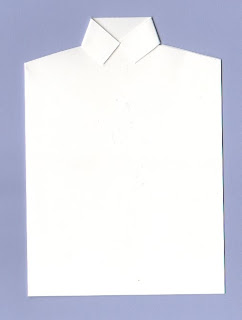 On the shirt template there is a + between the collar pieces, using a piercing tool pierce the centre.  Fold your piece of A5 Cardstock in half (this is your shirt), place the shirt template on the front of the card and secure with clips, carefully cut away the top of the card using the template as a guide, using a pencil through the hole mark the centre point on the collar.